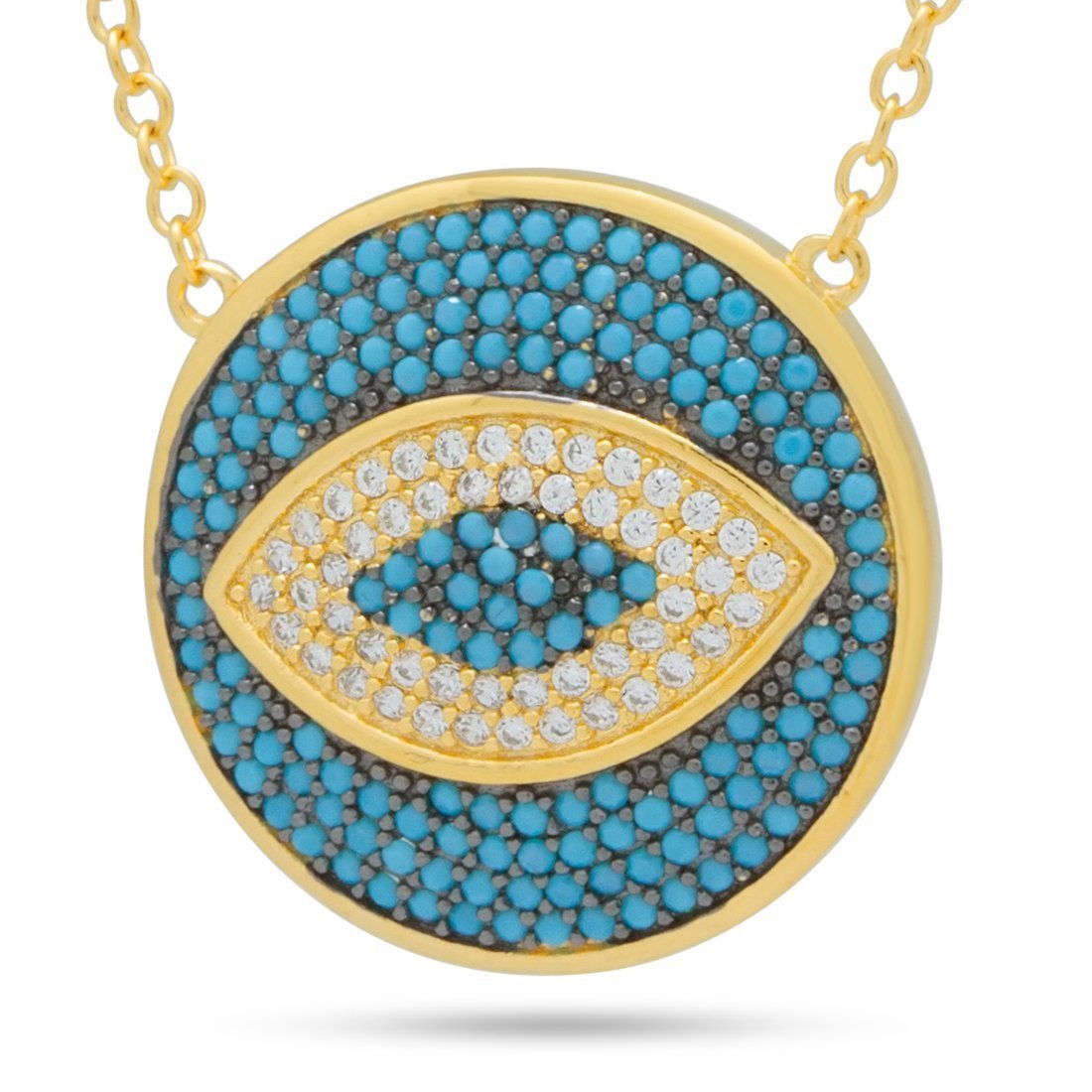 Legend has it the evil eye warns off malevolent stares when one isn't aware. Although there are different colors for evil eyes, the light blue turquoise grants protection, solitude and peace. It also serves as a means of broadening your perspective. Each evil eye is decorated with clear VVS Diamond Simulates and turquoise stones. The evil eye pendant comes with an attached 1mm, 17" Cable Chain that hangs from the top. Each necklace is finished with 14K Gold plating and made out of .925 Sterling Silver.