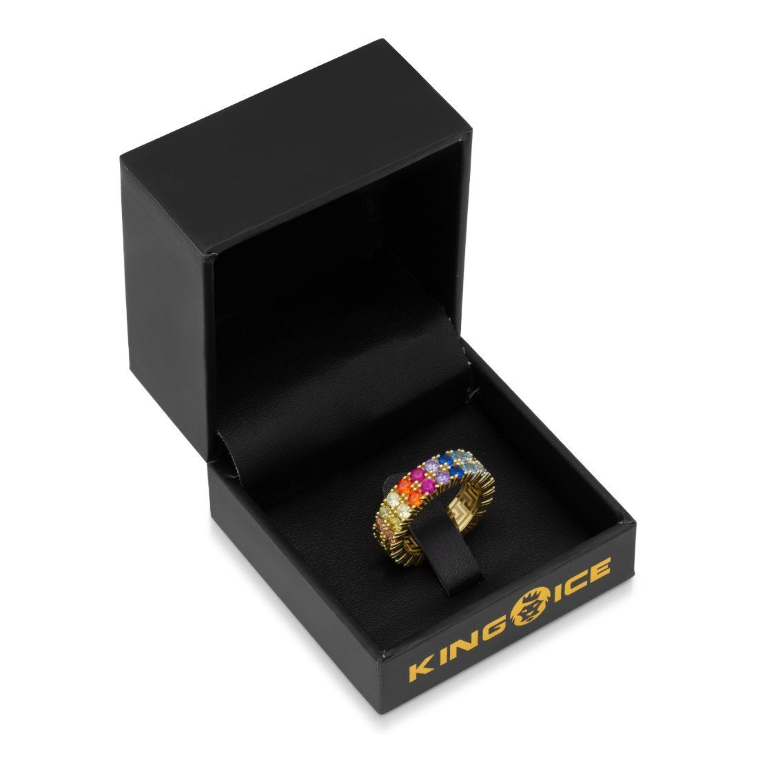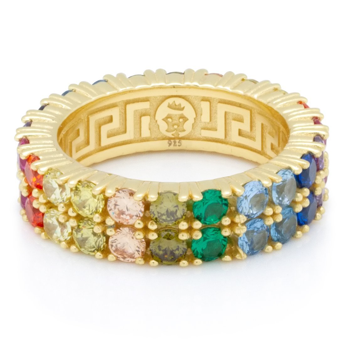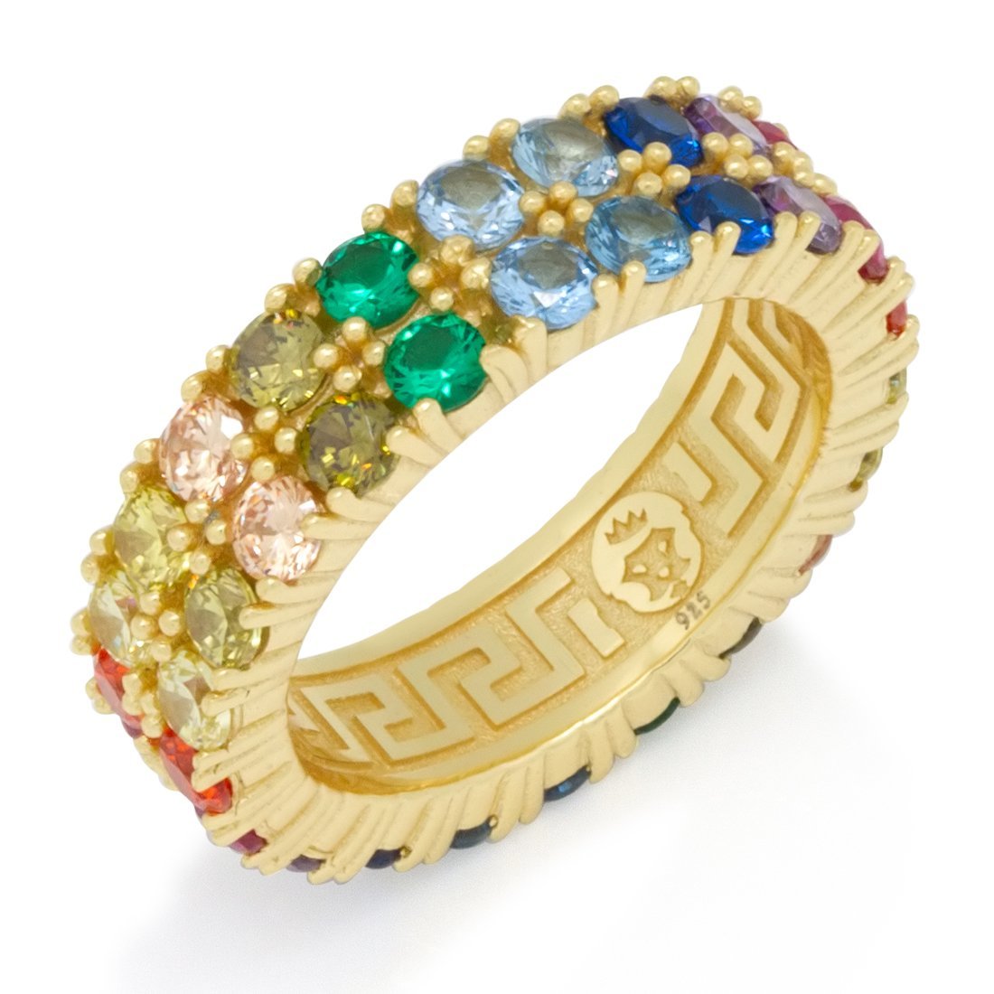 Eleven multicolored VVS Diamond Simulates form the rainbow band on the Double Row Spectrum Ring. The inside of the 14K Gold plated .925 Sterling Silver ring is engraved with Greek Key for the perfect finish.