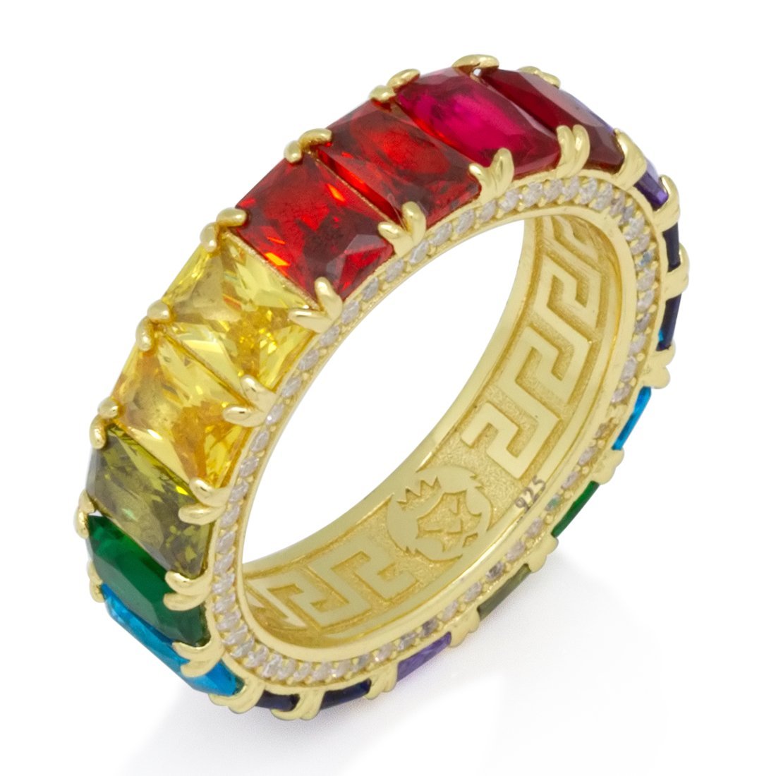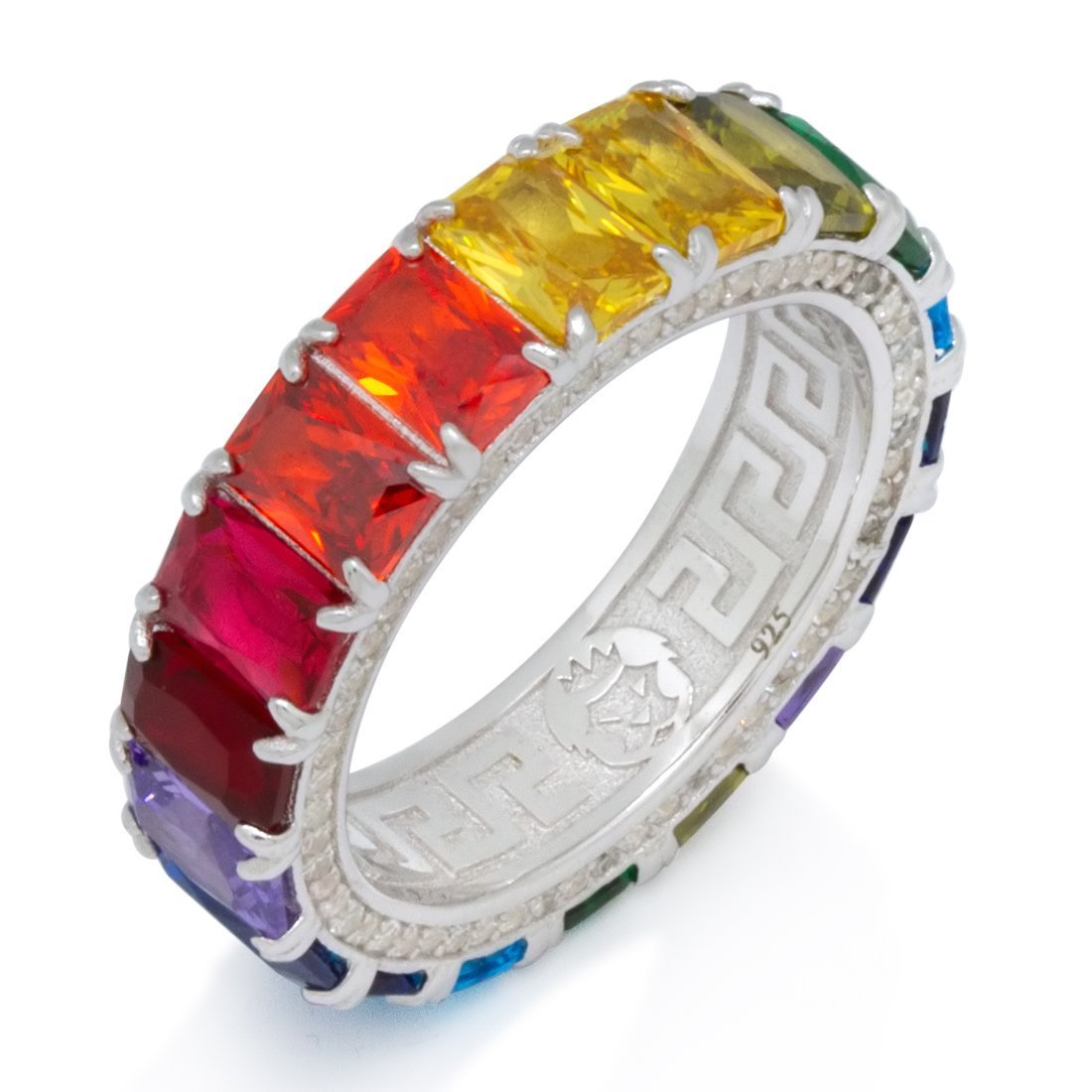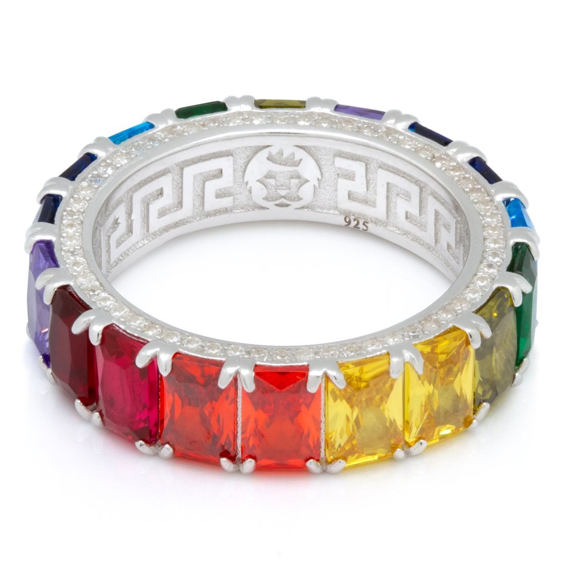 The brilliant Emerald Cut Spectrum Ring is surrounded with a rainbow of VVS Diamond Simulates in canary yellow, royal blue, candy red, and jade. The inside of each .925 Sterling Silver ring is decorated with a Greek Key design available in 14K Gold plating and white gold plating.