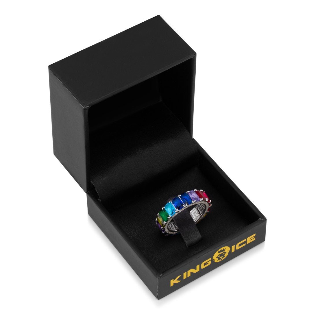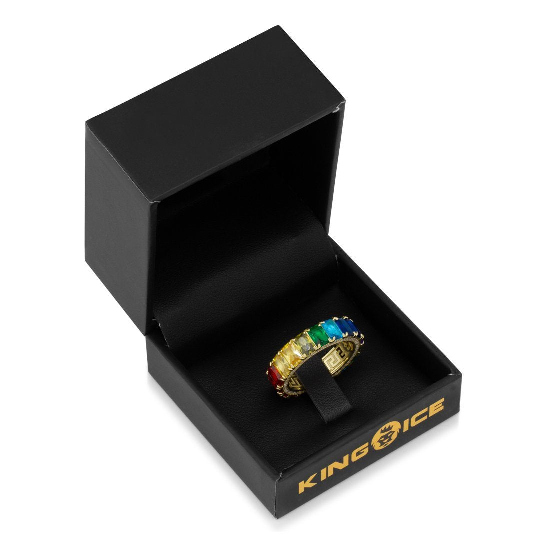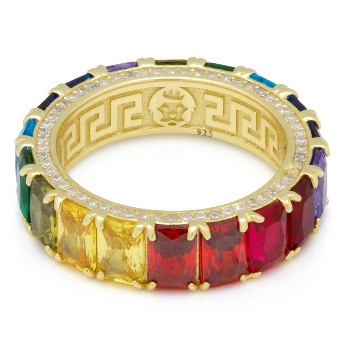 The brilliant Emerald Cut Spectrum Ring is surrounded with a rainbow of VVS Diamond Simulates in canary yellow, royal blue, candy red, and jade. The inside of each .925 Sterling Silver ring is decorated with a Greek Key design available in 14K Gold plating and white gold plating.