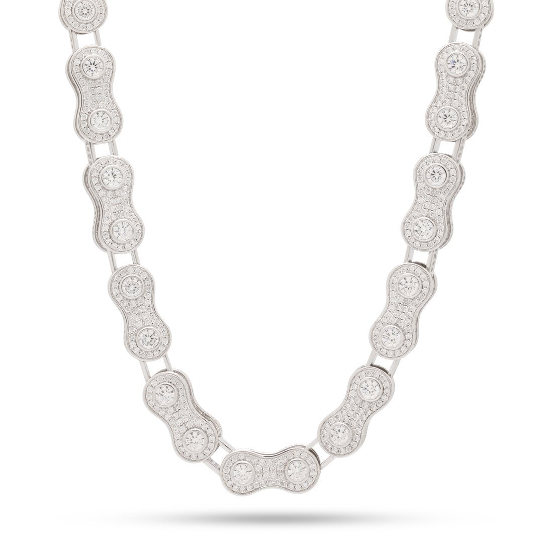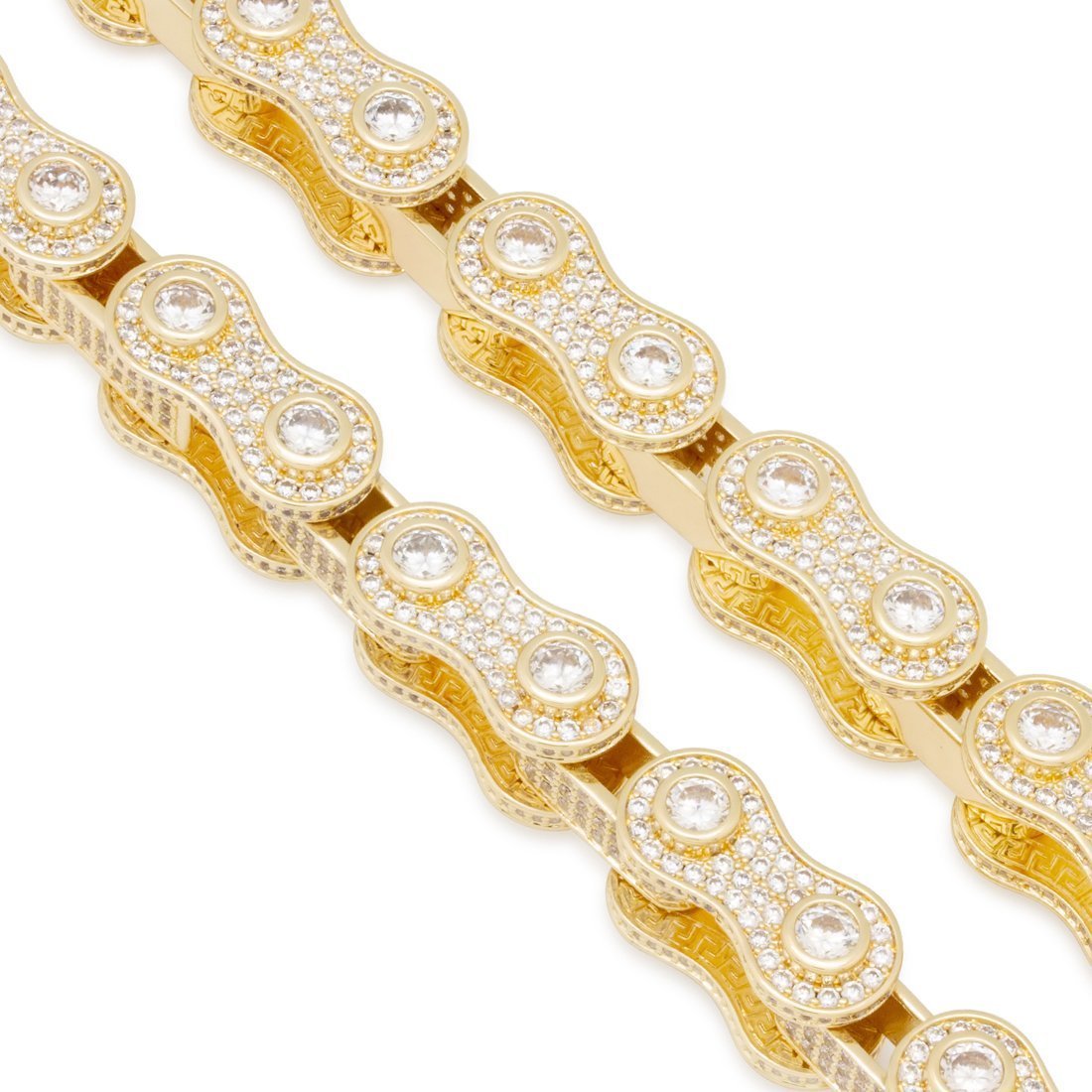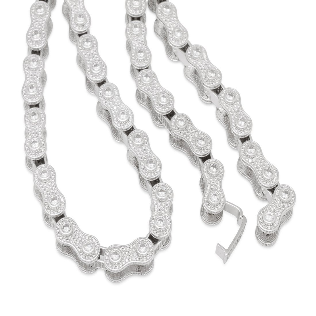 The new Iced Bike Chain has more than 3,500 clear handset CZ stones. Large CZ stones decorate the pins of the chain, while smaller stones cover the inner plates and rollers. The chain is available in 14K Gold plating and white gold plating, as well as in multiple lengths. The chain features a fold over clasp for a secure and comfortable wear. A Greek Key design is engraved on the inside of every link for the perfect finish.