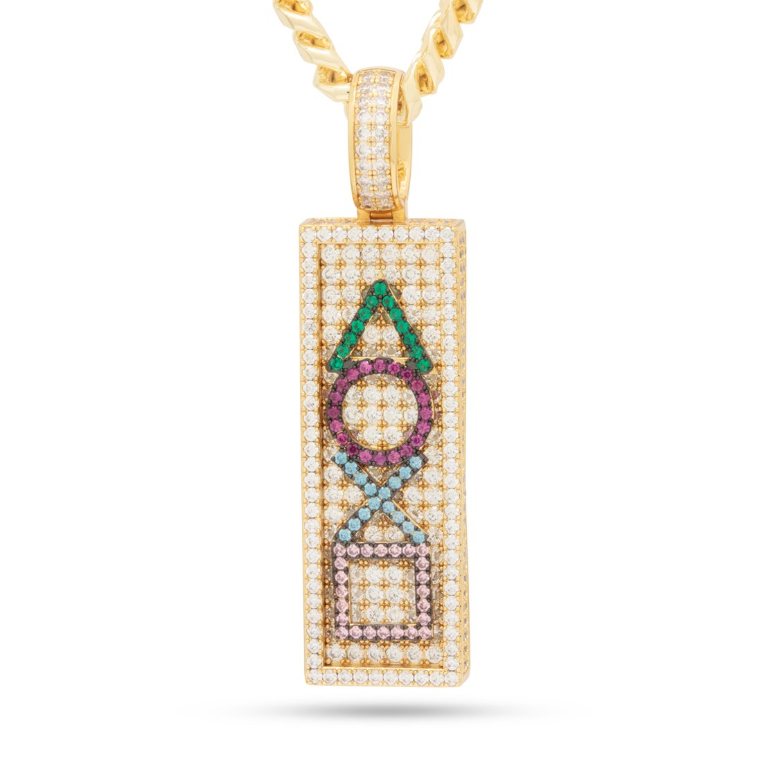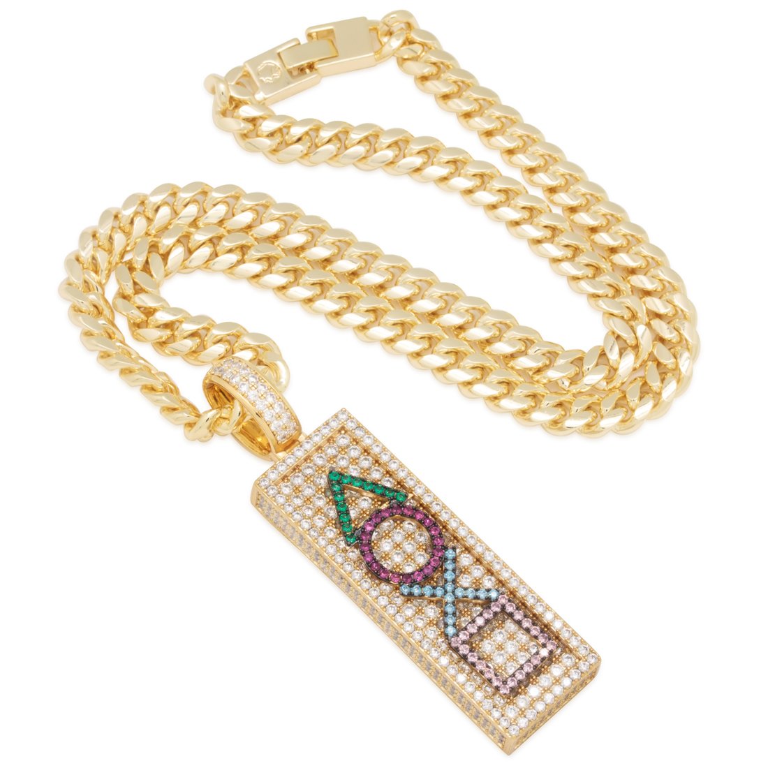 King Ice pays homage to these classic buttons with an icy statement. After it is dipped and plated five times in 14K Gold the pendant is then covered in VVS Simulates to finsih this iconic design. Each piece is paired with an 8mm, 20" Miami Cuban Chain.