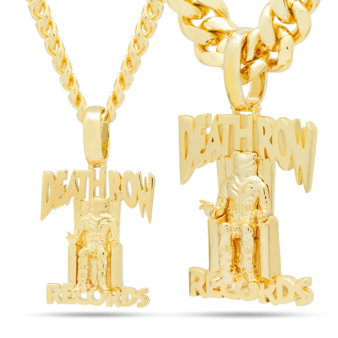 Using 14K Gold plating and white gold plating, the Death Row necklace perfectly resembles the iconic brand label. Each new XL size is paired with a 16mm, 20" Miami Cuban chain for a classic fit.