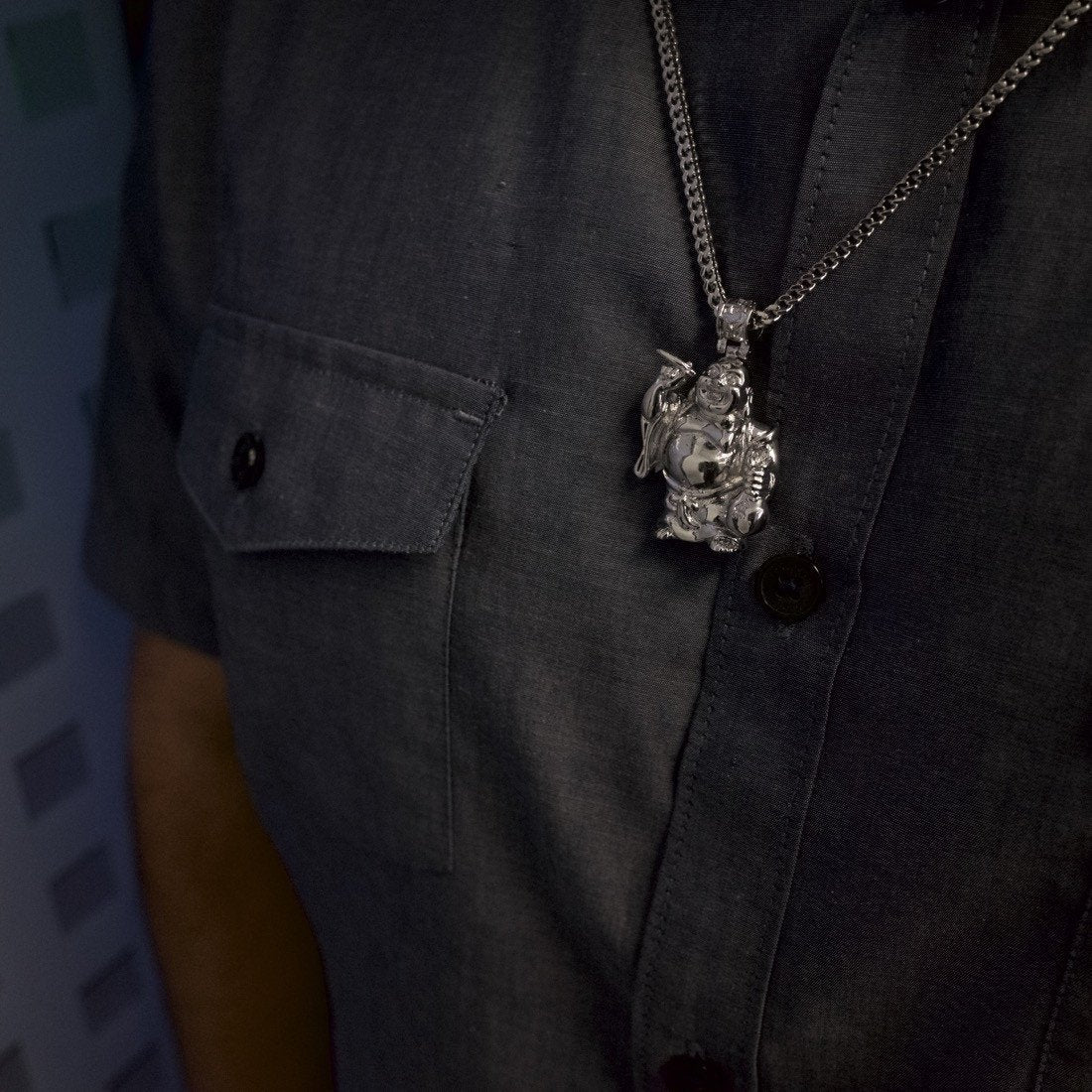 Known as the "Awakened One," Buddha remains revered for his teachings and wisdom, and ditching his conventional mediating stance and lotus leaf for both a money bag and a blunt comes this Laughing Buddha Necklace. Featuring his iconic robes and smile, this white gold-plated Buddha stands proud with both his blunt and stash of cash, giving him a one-of-kind look alongside its 26", 2.5mm stainless steel Franco chain.