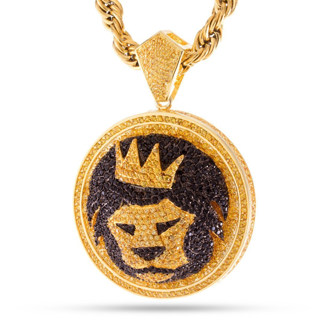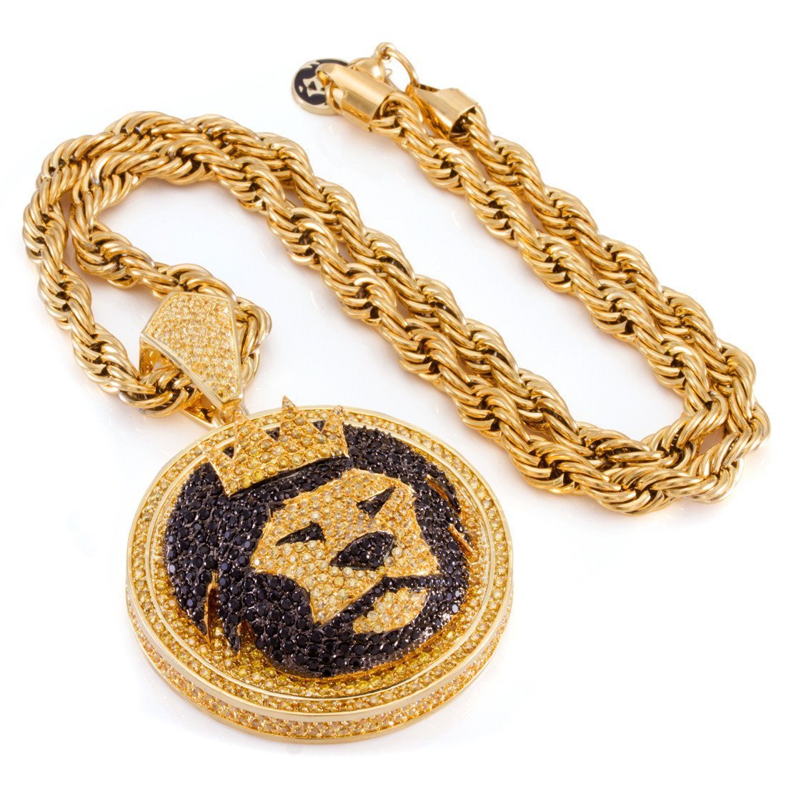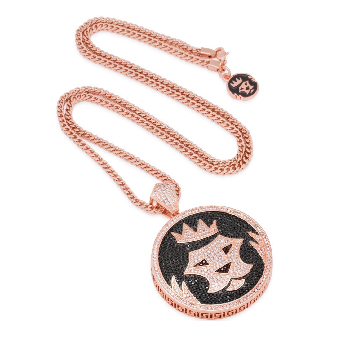 Our Magnus Lion Necklace stands out with its 3D design, iced with handset VVS Diamond Simulate stones. This piece is available plated in 14K Gold or White Gold. Each pendant is paired with an 8mm, 24" stainless steel rope chain.