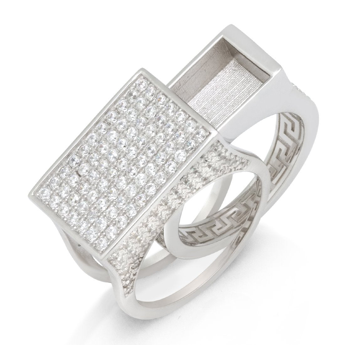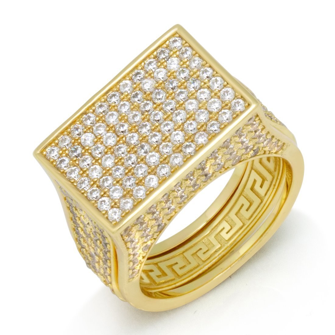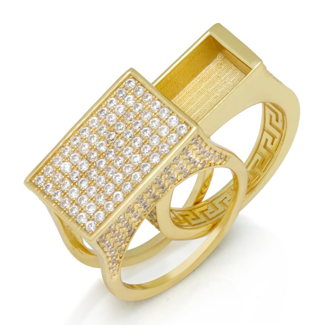 Developed in the 18th century, the Poison ring served as a way to silence enemies. Now, you can use it to store all of your hidden items into this discreet ring. Plated in 14K Gold with a sleek Greek Key design, the ring is lined with handset VVS Diamond Simulate stones.