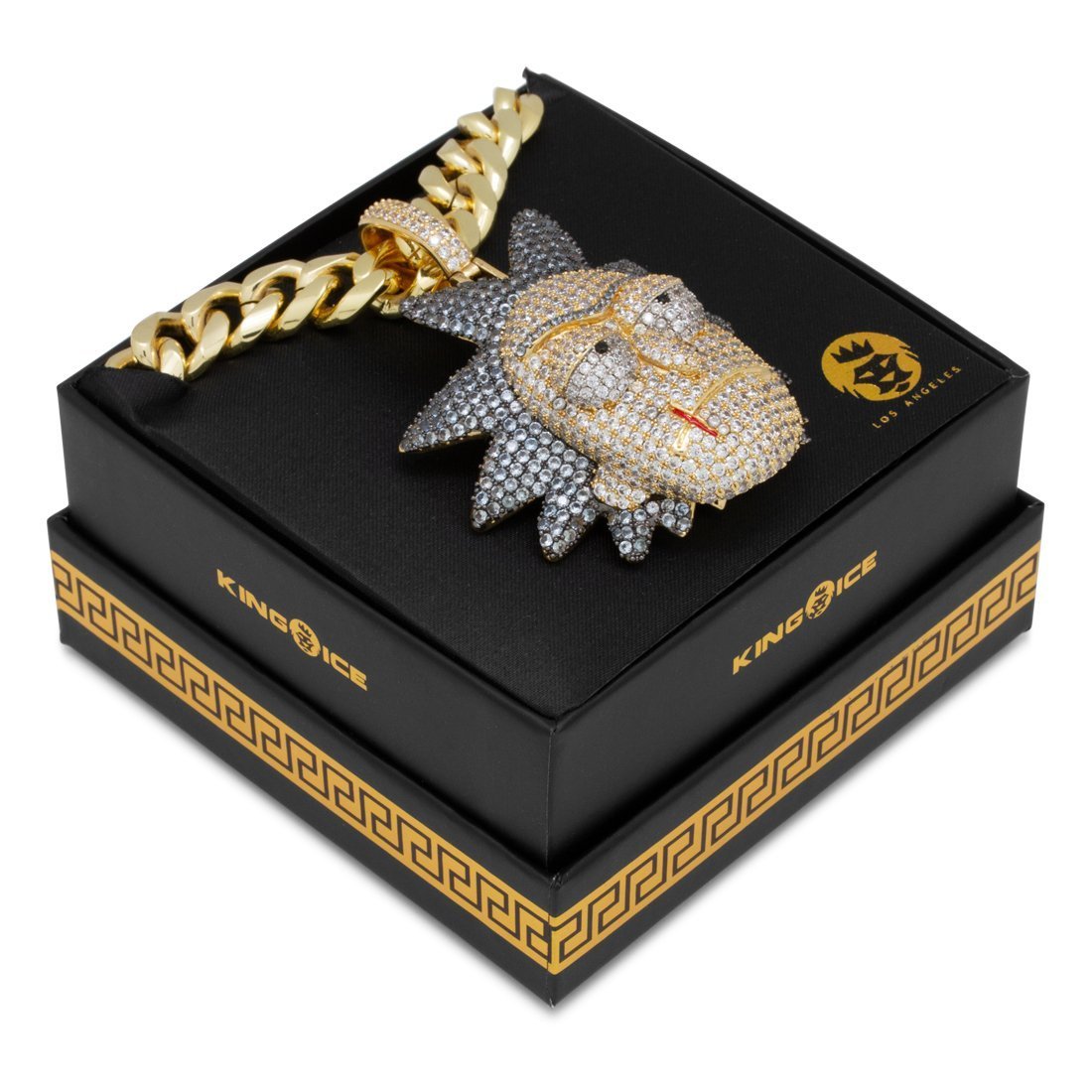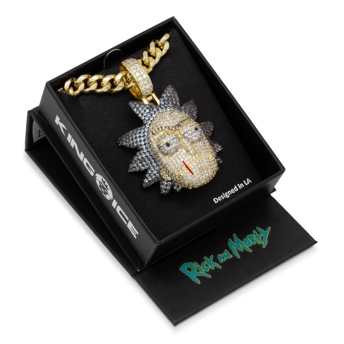 The Evil Rick pendant showcases the mad scientist in VVS Diamond Simulate stones and 14K Gold plating for a vibrant display. Black gold plating serves as the base for Rick's hair. The 3D design details his furrowed brow and frown. Each pendant is paired with an 8mm, 24" Miami Cuban chain.