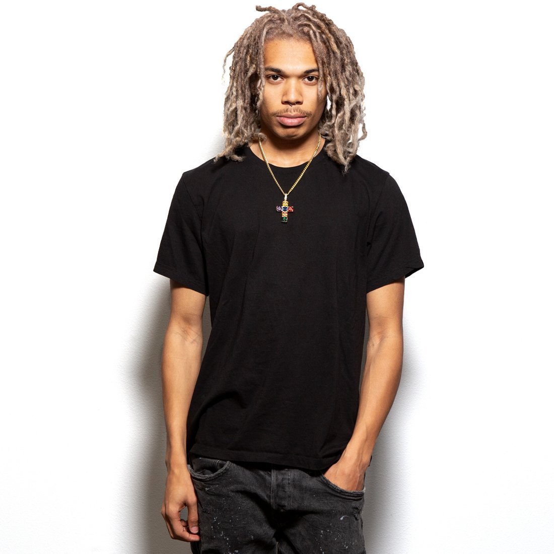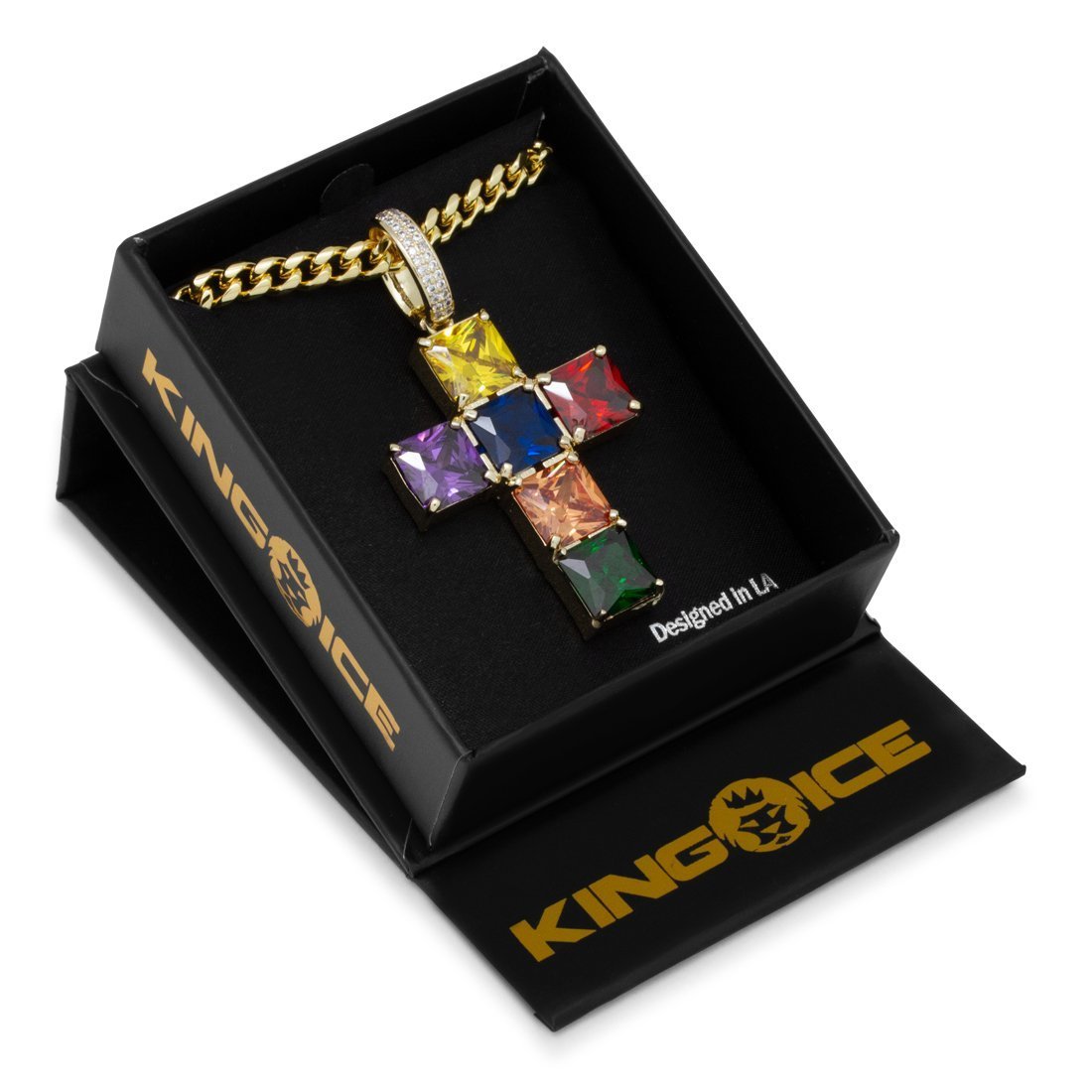The Spectrum Cross Necklace is iced with multicolored VVS Diamond Simulates to form the spectrum rainbow. The 14K Gold plated necklace has Greek Key design on the back for a subtle finish. Each necklace is paired with a 5mm Miami Cuban Chain 20".