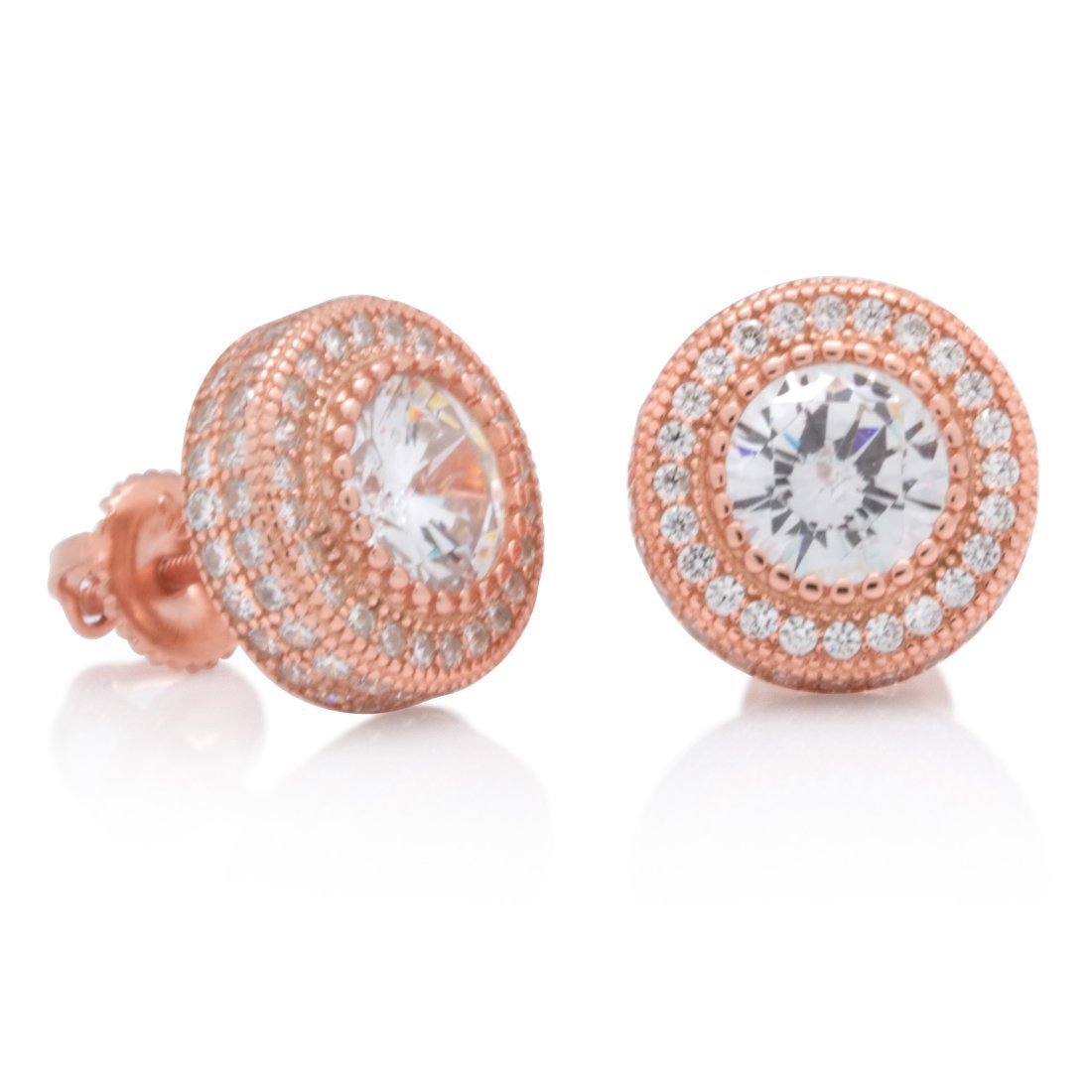 A pair of round shaped cluster earrings made from .925 sterling silver iced with clear handset VVS Diamond Simulate stones. These earrings measure 11mm in size, contain a screw-back design, and are available in 14K gold plating, white gold plating, and rose gold plating.