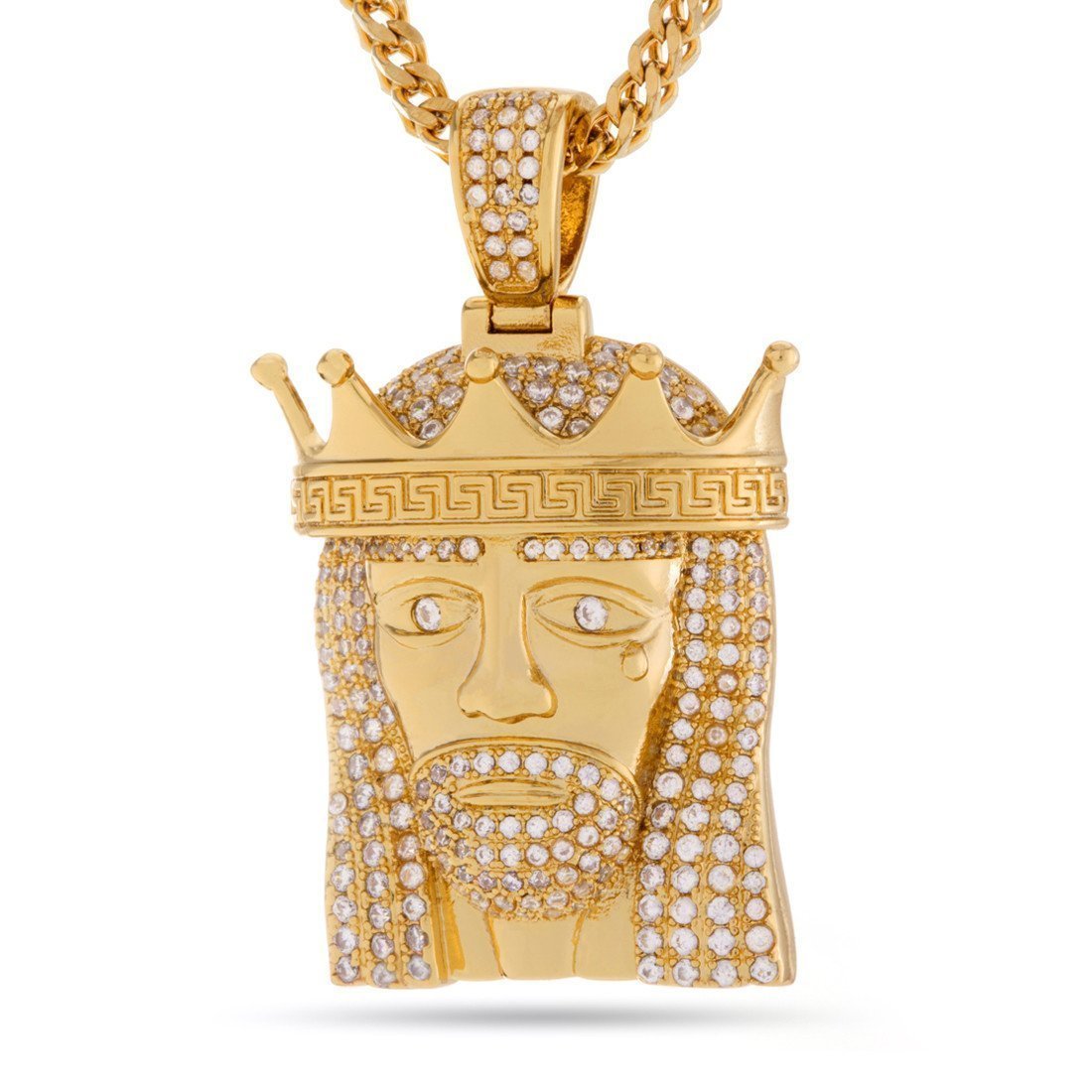 Known as the King of Kings, Jesus remains a staple piece in streetwear. Now introducing another piece into our growing collection of Jesus pieces, the King of King pendants comes dipped in 14K gold plating and uses AAA, handset stones to recreate its look. Each piece includes a 26”, 2.5mm stainless steel Franco chain.