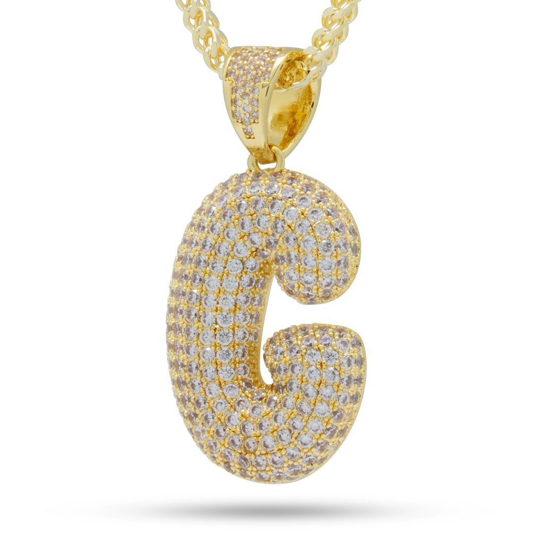 Plated in 14K Gold and lined with clear VVS Diamond Simulates, the Bubble Letters create an iconic street wear staple piece. Each piece belonging to the collection features a 2.5mm 14K Gold plated, 20" Franco chain to complete its look.
