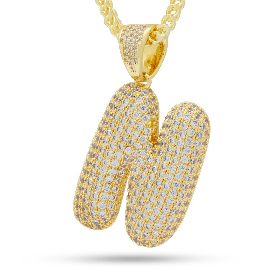 Plated in 14K Gold and lined with clear VVS Diamond Simulates, the Bubble Letters create an iconic street wear staple piece. Each piece belonging to the collection features a 2.5mm, 20" Franco chain to complete its look.