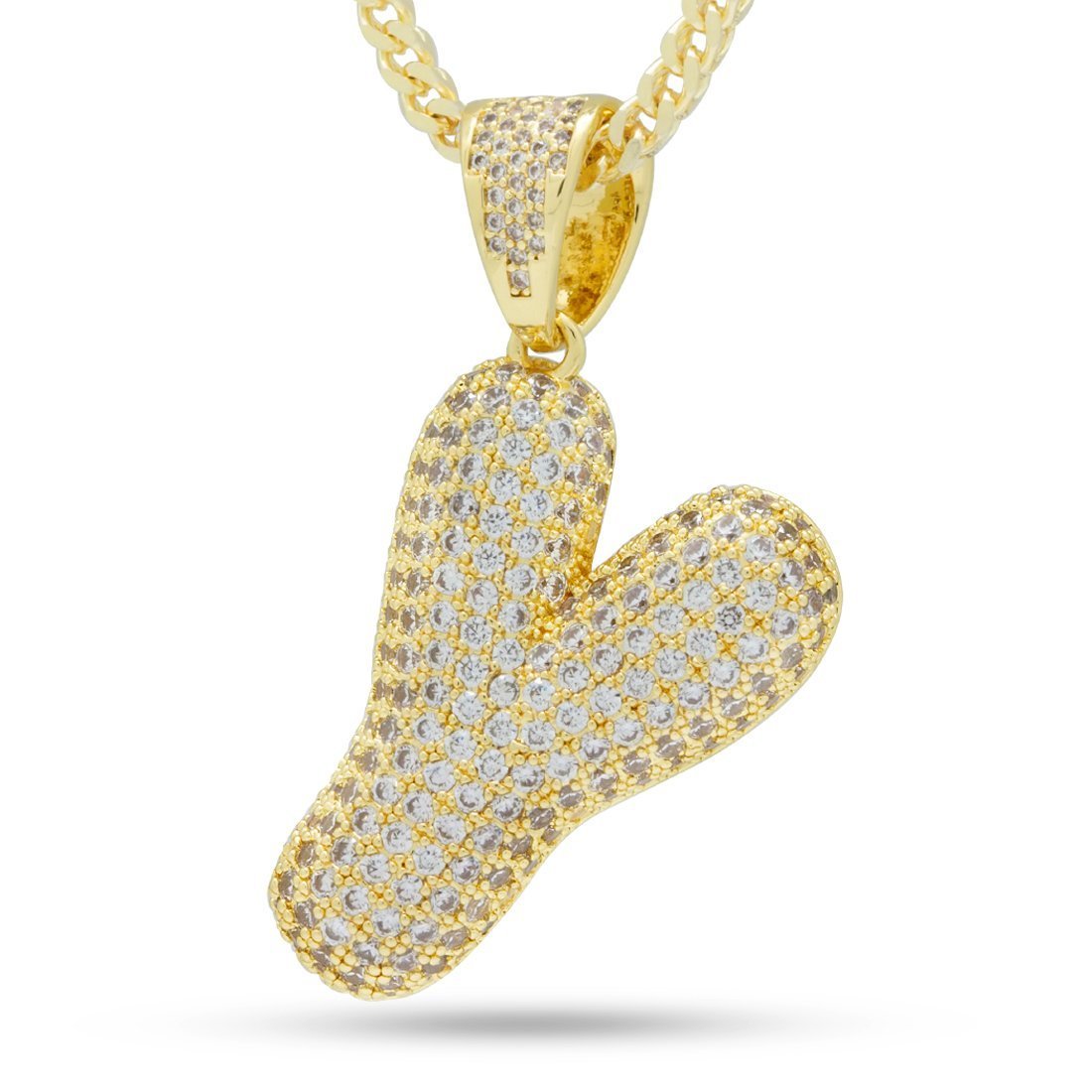 Plated in 14K Gold and lined with clear VVS Diamond Simulates, the Bubble Letters create an iconic street wear staple piece. Each piece belonging to the collection features a 2.5mm 14K Gold plated, 20" Franco chain to complete its look.