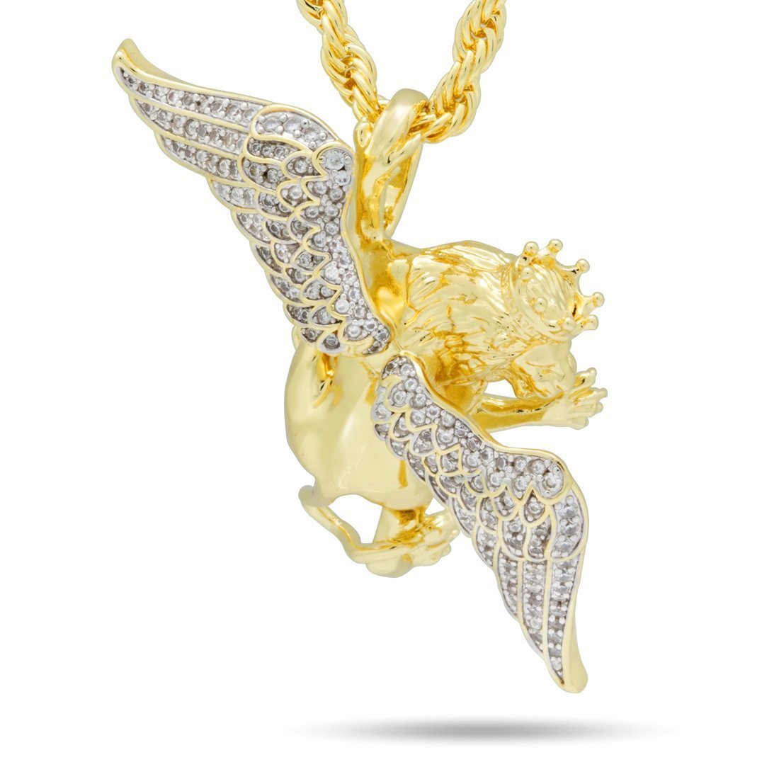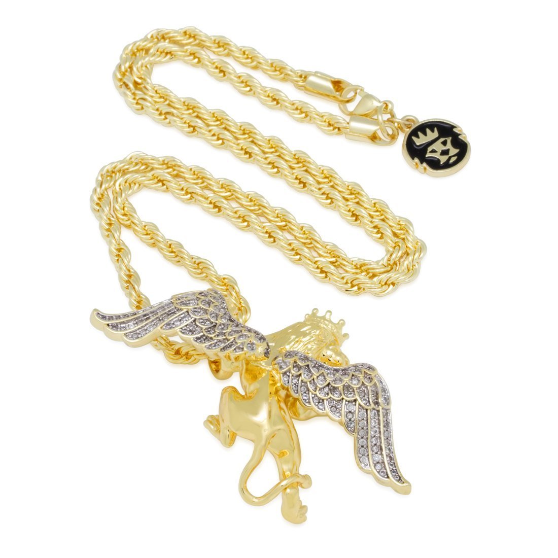 Lions are always ready to pounce. Known for being strong, courageous, and majestic, the wings add intelligence. The crown on the Large Flying Lion King necklace adds the finishing touch of majesty. Plated in 14K Gold, the gleaming wings are iced with VVS Diamond Simulates. Each necklace comes with a 4mm, 20" Rope Chain.