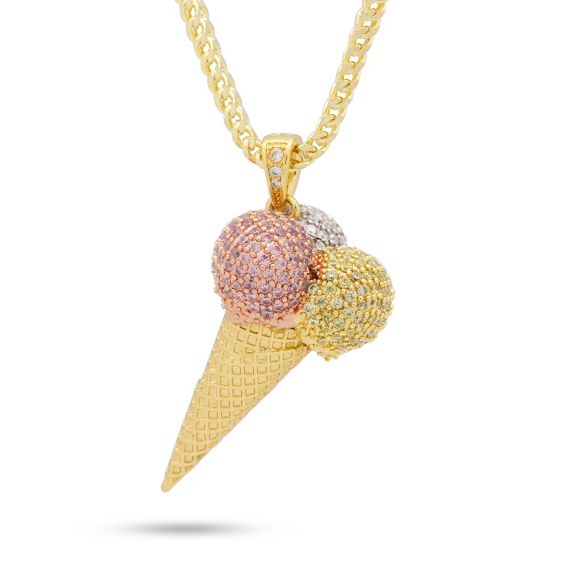 Brrr, the Ice Cream Necklace is as cold as Ice. The three different scoops of ice cream are finished in various gold plating and has Grade AAA lab diamonds. Each piece is paired with a 26" 2.5mm stainless steel Franco chain.