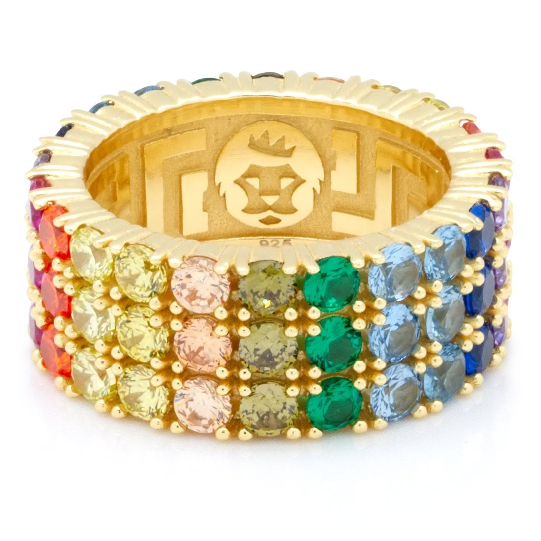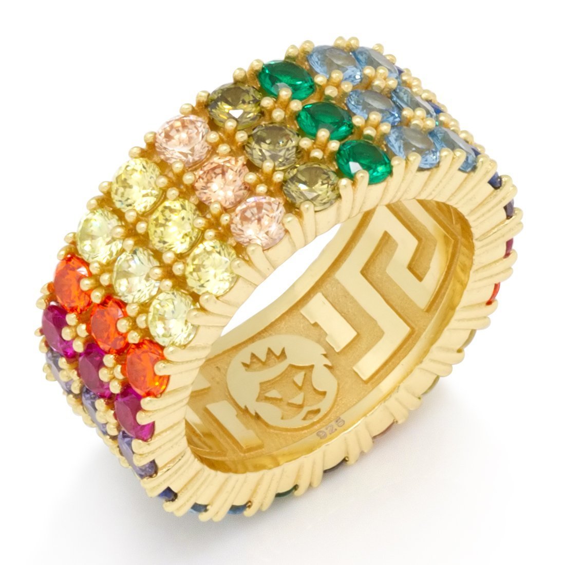Eleven multicolored VVS Diamond Simulates form the rainbow band on the Triple Row Spectrum Ring. The inside of the 14K Gold plated .925 Sterling Silver ring is engraved with Greek Key for the perfect finish.