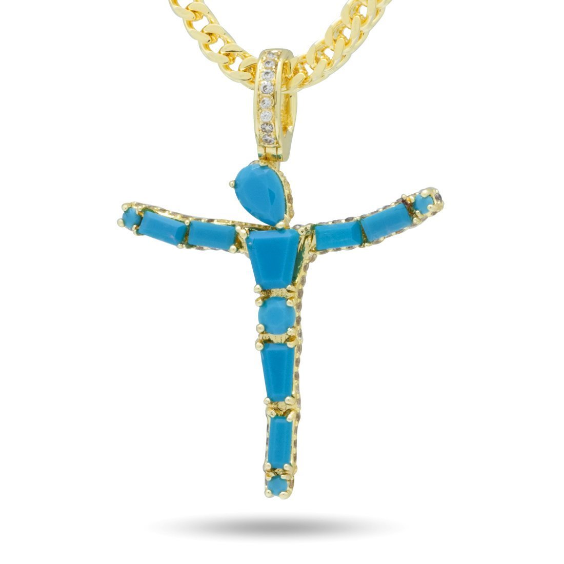 The Turquoise Crucifix Cross Necklace pays homage to Jesus' birth month of December. Turquoise stones represent nobility and wisdom, something many can relate to. The stones emit a relaxing and serene vibe meant to calm any being. Clear VVS Diamond Simulates line the edges of the crucifix for a clean and subtle finish. Each necklace is plated with a 14K Gold finish and comes with a 2.5mm, 20" Franco Chain.